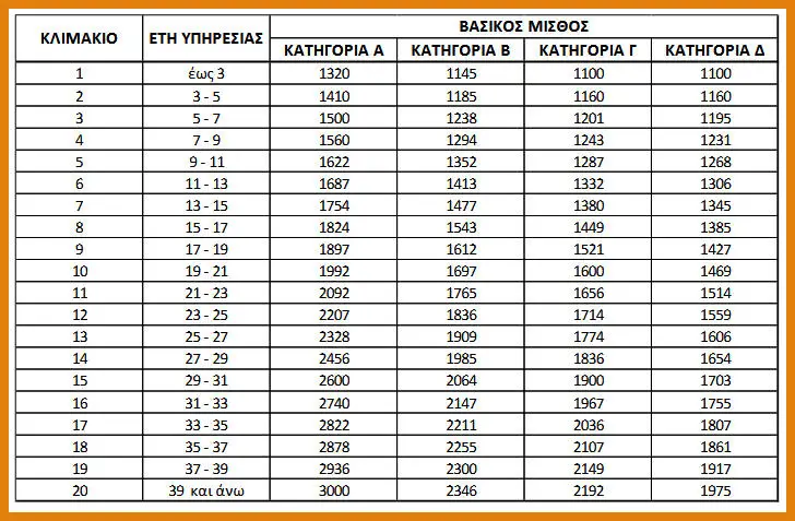 - Ο βασικός μισθός προσαυξάνεται με συντελεστή ανάλογα με τον βαθμό και την κατηγορία μισθολογικής κατάταξης. Οι συντελεστές αυτοί ξεκινούν από το 1,00 και ανεβαίνουν έως το 1,8.