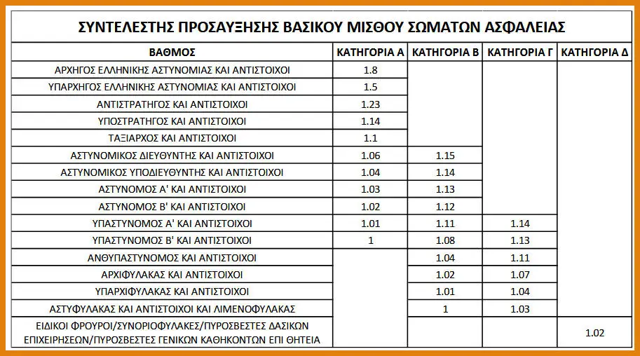 - Ο μηνιαίος βασικός μισθός των στελεχών των Σωμάτων Ασφαλείας καθορίζεται ανά μισθολογικό κλιμάκιο, κατηγορία μισθολογικής κατάταξης και έτη υπηρεσίας.