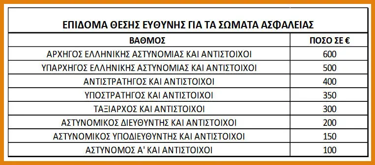 γ) Επίδομα θέσης ευθύνης. Καταβάλλεται μηνιαίως σε όσους ασκούν ουσιαστικά καθήκοντα διοίκησης/ευθύνης. Το ύψος του εξαρτάται από τον βαθμό. Ενδεικτικά, προβλέπονται μηνιαία ποσά που ξεκινούν από τα 100 ευρώ για έναν Αστυνόμο Α’ και ανεβαίνουν κλιμακωτά (150 ευρώ για Υποδιευθυντή, 200 ευρώ για Διευθυντή κ.λπ.) έως 300 ευρώ για Ταξίαρχο, 400 ευρώ για Αντιστράτηγο, 500 ευρώ για Υπαρχηγό και φτάνουν 600 ευρώ για τον Αρχηγό κάθε Σώματος. Βασική προϋπόθεση για να χορηγηθεί είναι να ασκούνται πράγματι τα καθήκοντα. Αν το στέλεχος πάψει να τα ασκεί λόγω απόσπασης, μετακίνησης, διάθεσης ή άδειας μεγάλης διάρκειας, το επίδομα σταματά άμεσα.