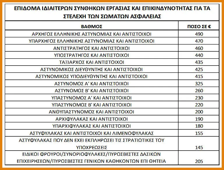 β) Επίδομα ιδιαίτερων συνθηκών εργασίας και επικινδυνότητας. Καταβάλλεται λόγω της φύσης της αποστολής, της επικινδυνότητας, της ετοιμότητας και της απασχόλησης χωρίς τυπικό ωράριο ή πέραν αυτού. Το ύψος του επιδόματος εξαρτάται από τον βαθμό. Ειδικότερα για τον Αρχηγό προβλέπεται ποσό της τάξεως των 490 ευρώ, για τον Υπαρχηγό 470 ευρώ, για Αντιστράτηγο 460 ευρώ, για Υποστράτηγο 440 ευρώ, για Ταξίαρχο 435 ευρώ και 415 ευρώ για Αστυνομικό Υποδιευθυντή. Για προσωπικό όπως οι ειδικοί φρουροί, συνοριοφύλακες και πυροσβέστες δασικών επιχειρήσεων/γενικών καθηκόντων επί θητεία το επίδομα ανέρχεται σε 205 ευρώ.